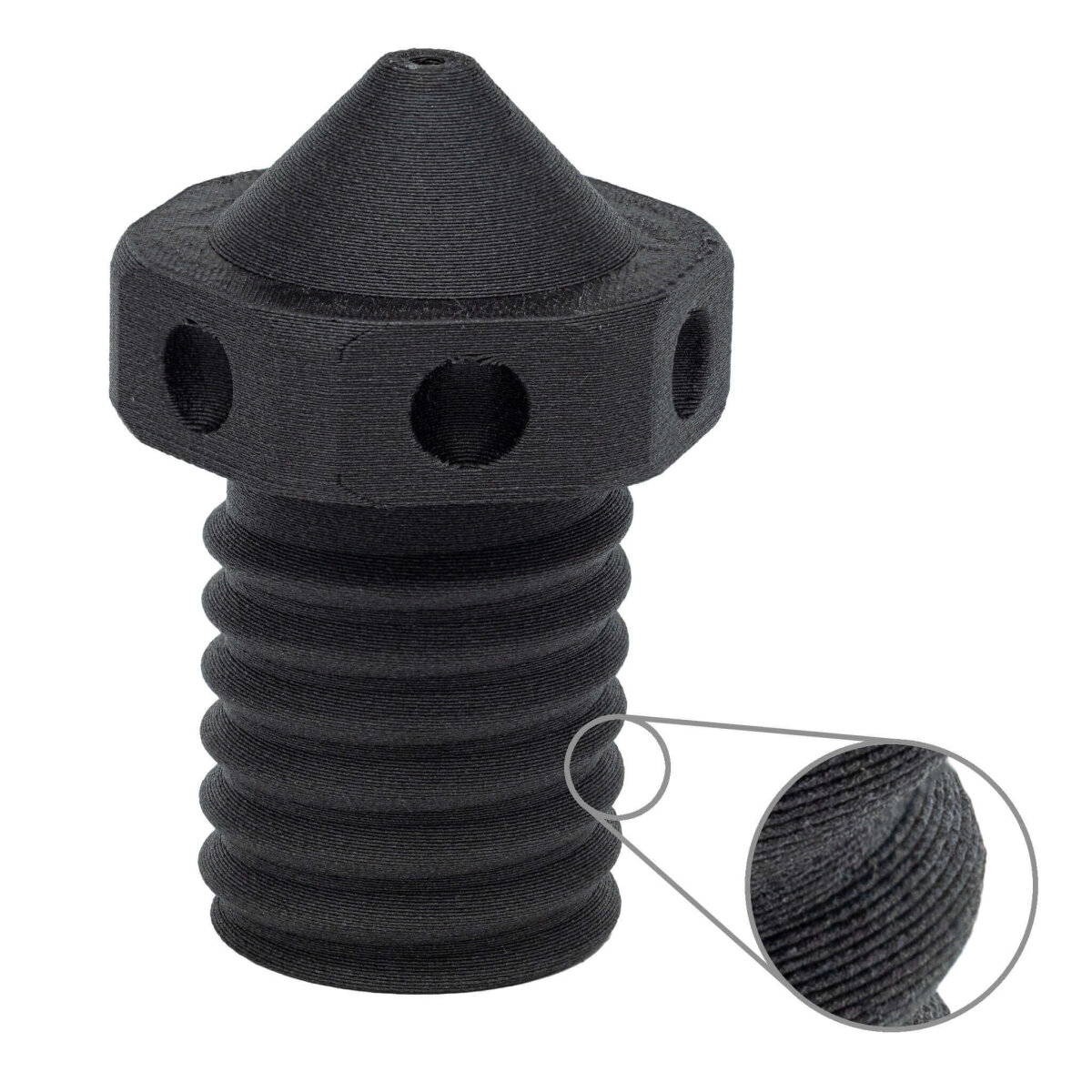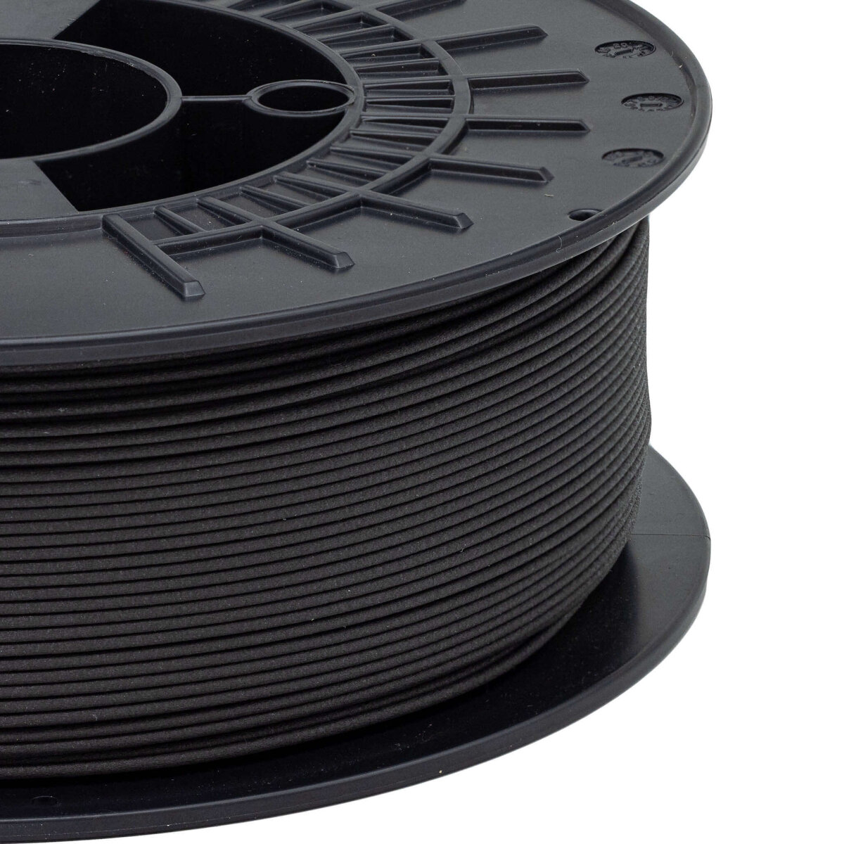 Nylon PA6 CF15 Filament ist ein schwarzes Hochtemperatur-, auf PA6 basierendes Konstruktionsmaterial. Eine Anreicherung mit 15% Carbonfaser erhöht die mechanische Festigkeit des Polyamid Basismaterials signifikant. Der Vorteil dieses Kompositionsmaterials ist zudem die halbierte Feuchtigkeitsaufnahme und die viermal geringere Wasseraufnahme im Vergleich zu regulärem PA6. Zusätzlich weist PA6 CF15 eine sehr geringe lineare Schrumpfung von bis zu 0.1% auf wodurch der Warpingeffekt sehr gering ausfällt. Die Erweichungstemperatur dieses Materials liegt bei 240°C. Als Arbeitstemperatur hält es bis zu 200h bei 180°C stand, bei 160°C sind sogar bis zu 20.000h möglich. Der Wärmeausdehnungskoeffizient liegt bei 0,4*10^(-5)/K.